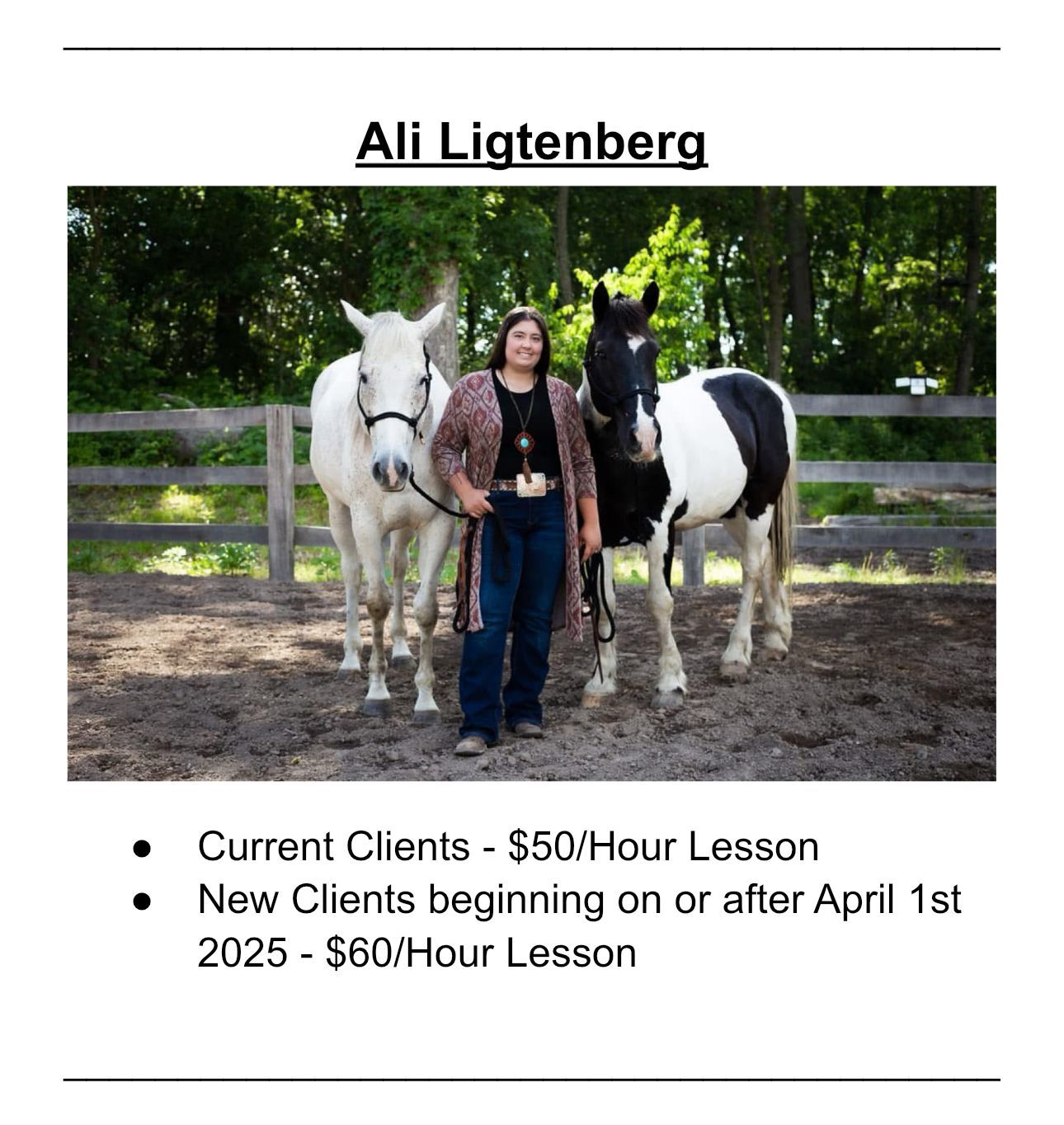 Beginning in 2015, Ali Ligtenberg began doing beginner horseback riding lessons as a hobby to teach a good friends daughter how to ride. This was a dream come true for that little girl and there was nothing better than getting to help make that dream become a reality to Ali. Every year since then Ali decided to grow her lesson business as friends and family spread the word of her work. “Til this day, there is still no better feeling in the world than being able to help make dreams come true. I feel apart of something life changing and I have never felt happier with this decision to go full time.” -Ali Ligtenberg.